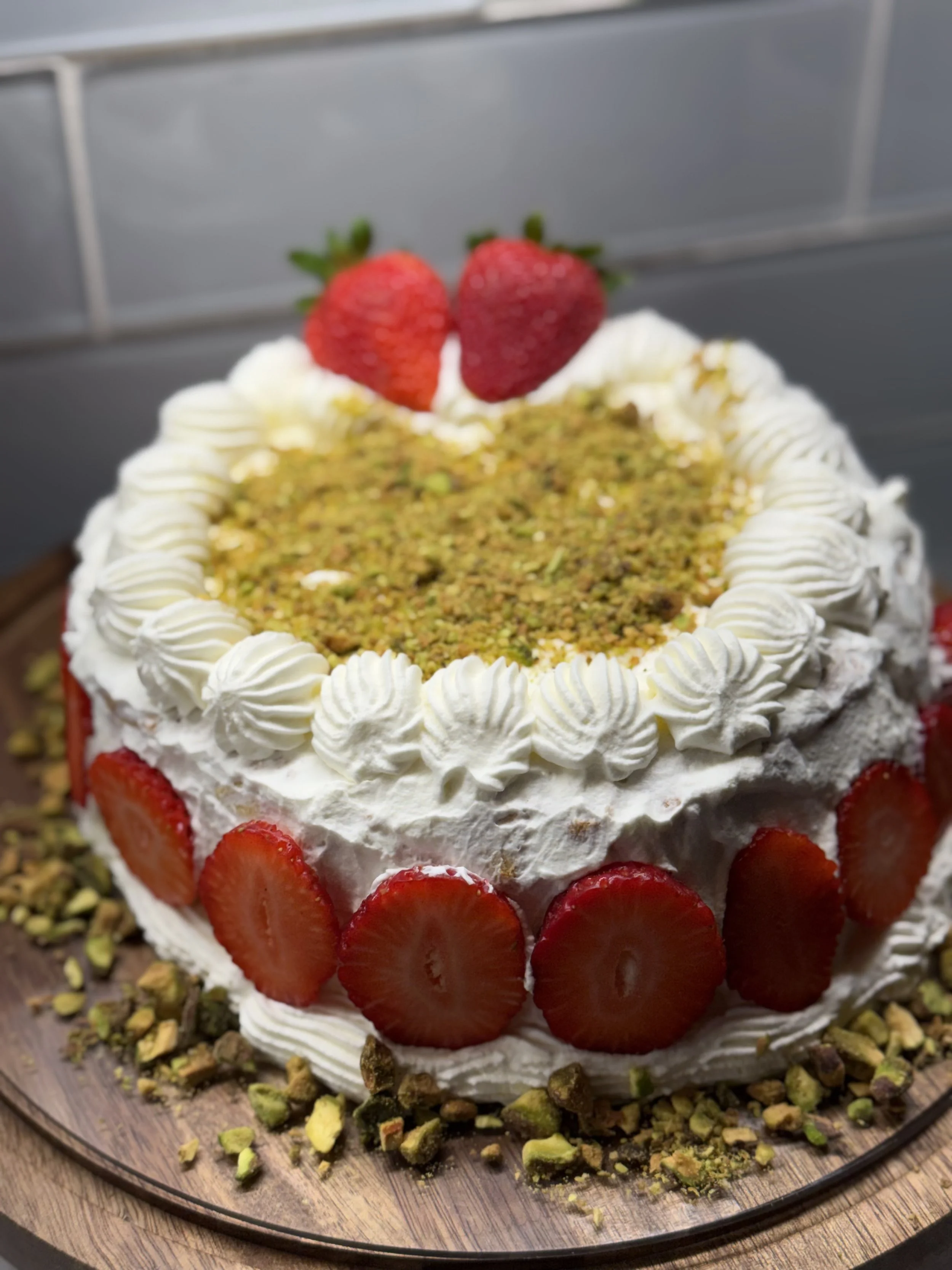 Pistachio — especially associated with Sicily — brings depth and earthiness. Fresh strawberries bring brightness. And instead of heavy buttercream, we finish with lightly sweetened panna montata — whipped cream — because restraint is often what makes Italian desserts elegant.
